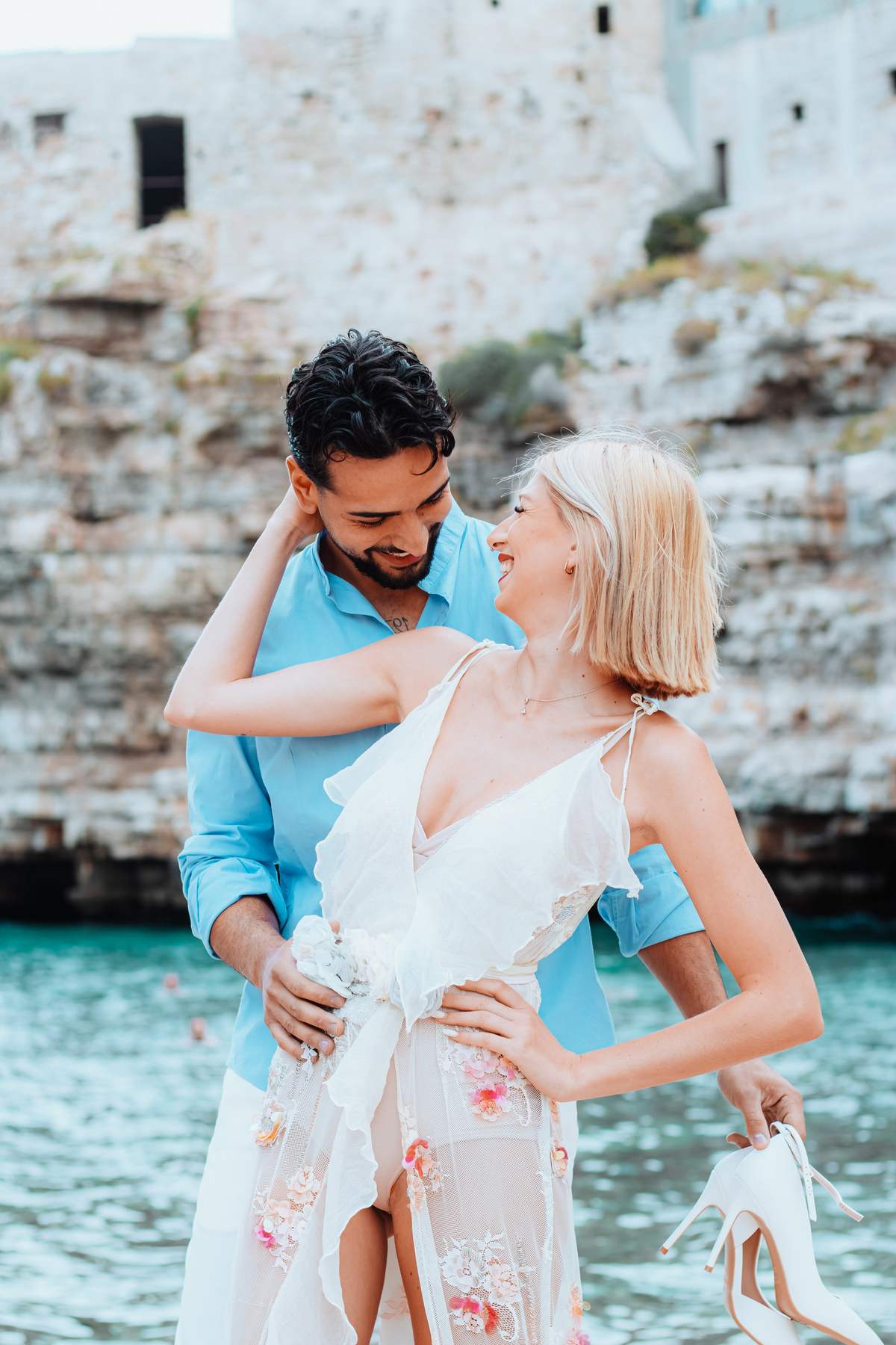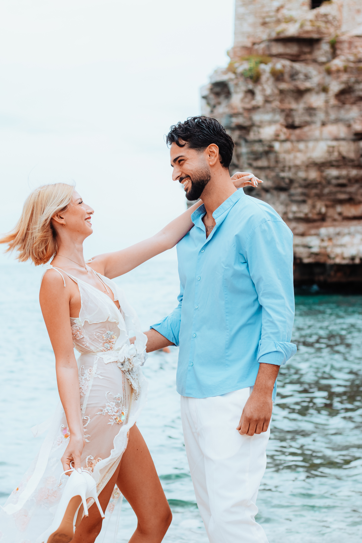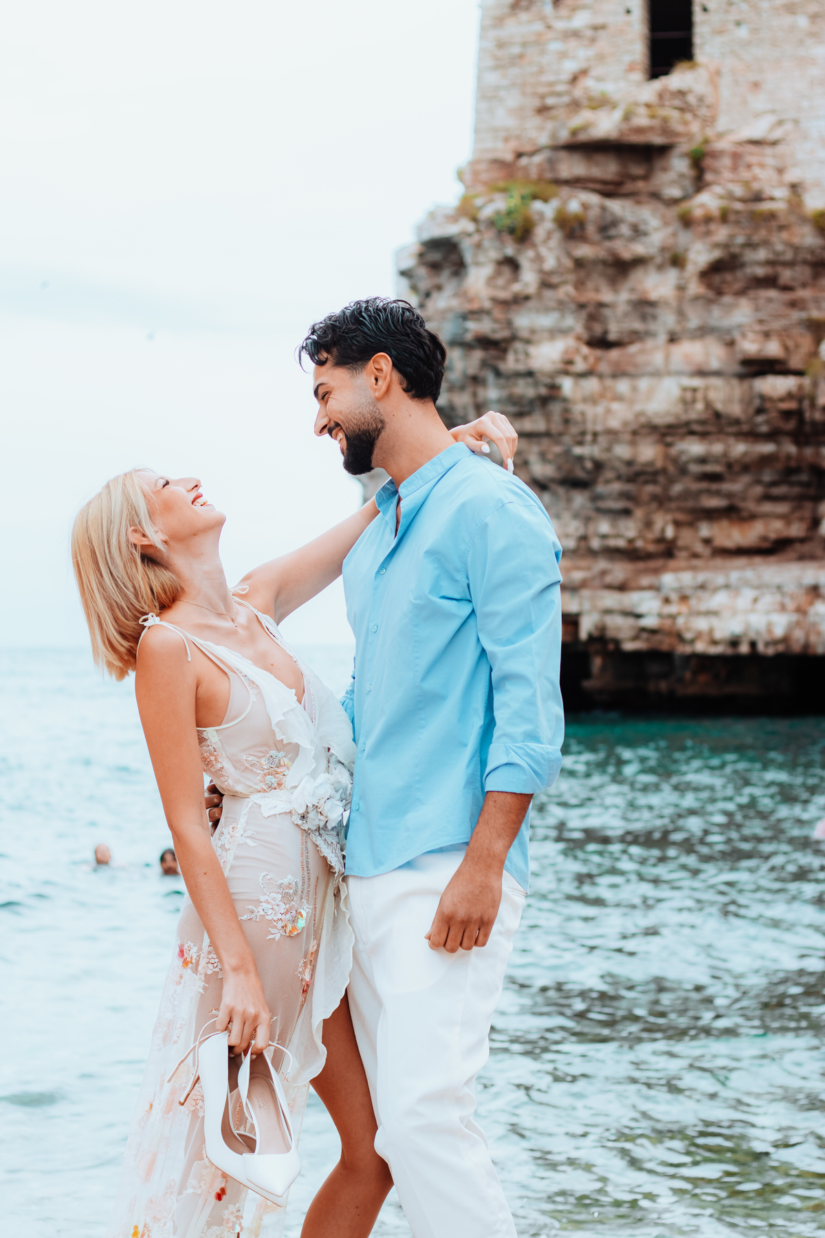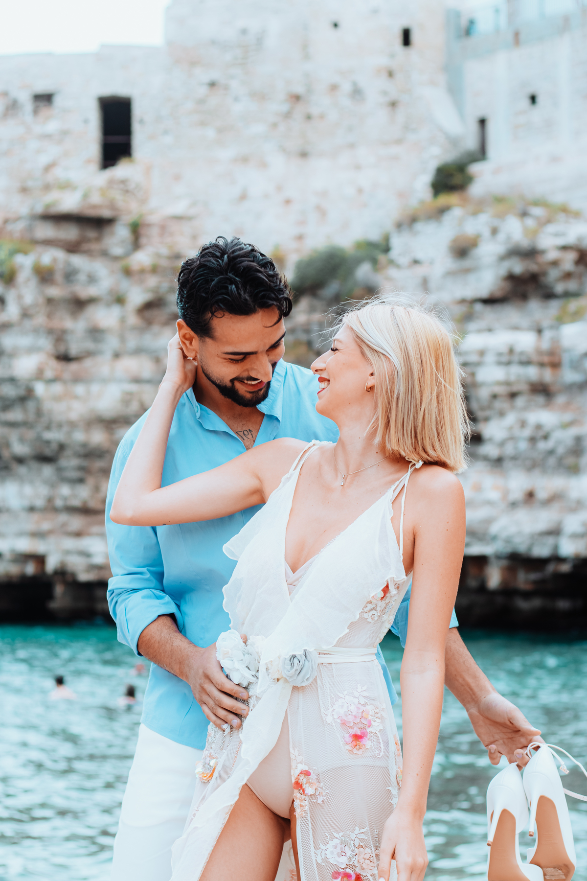 Em Polignano a Mare, esse casal viveu um pré-wedding cheio de vida e de significado. Entre o azul do mar, os gestos espontâneos e a alegria que transbordava, cada instante se transformou em memória eterna.