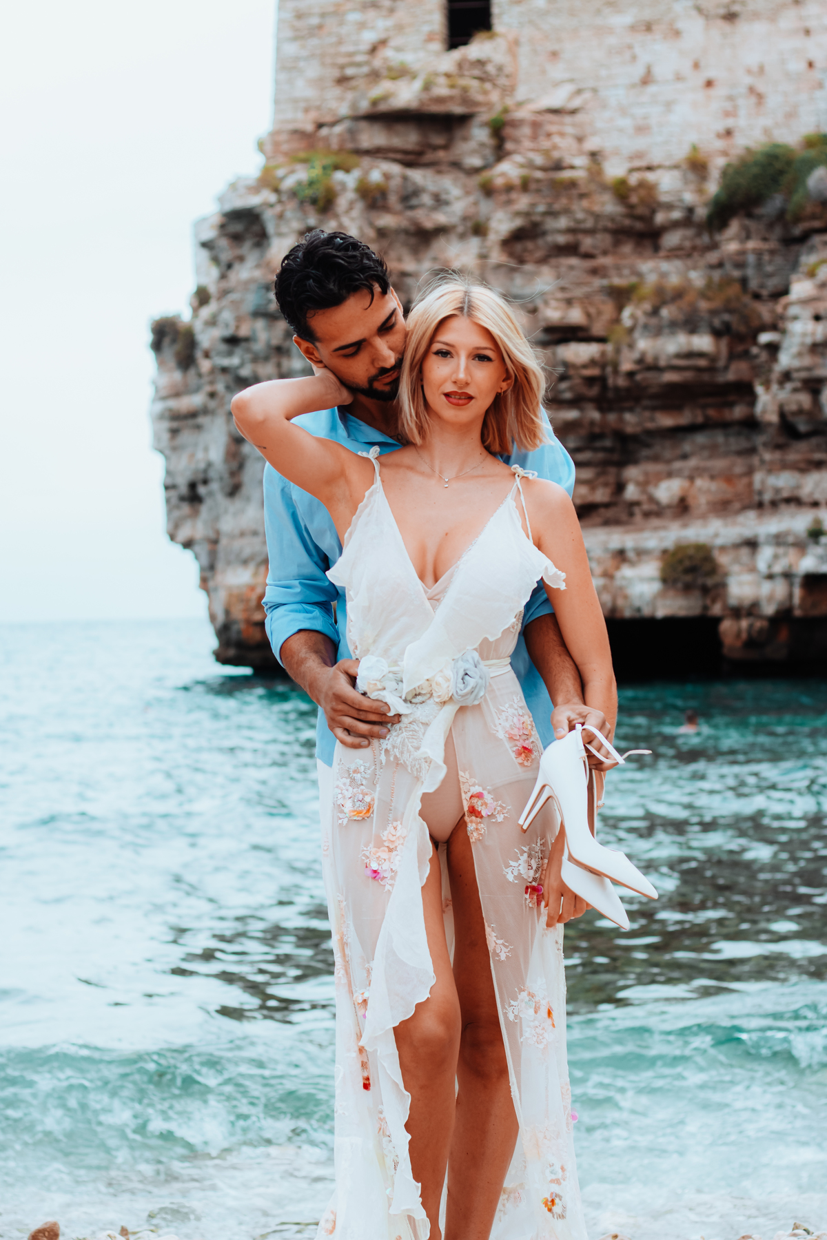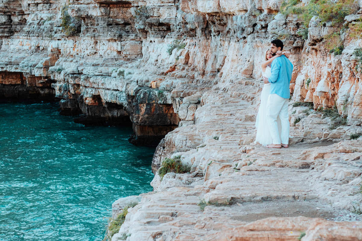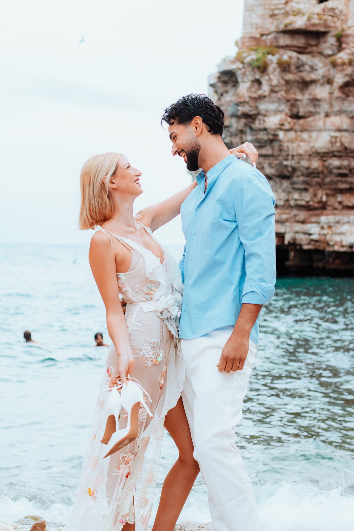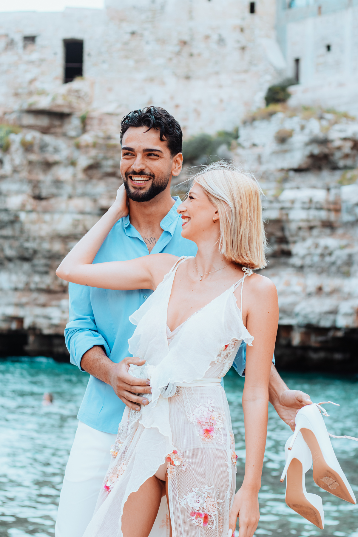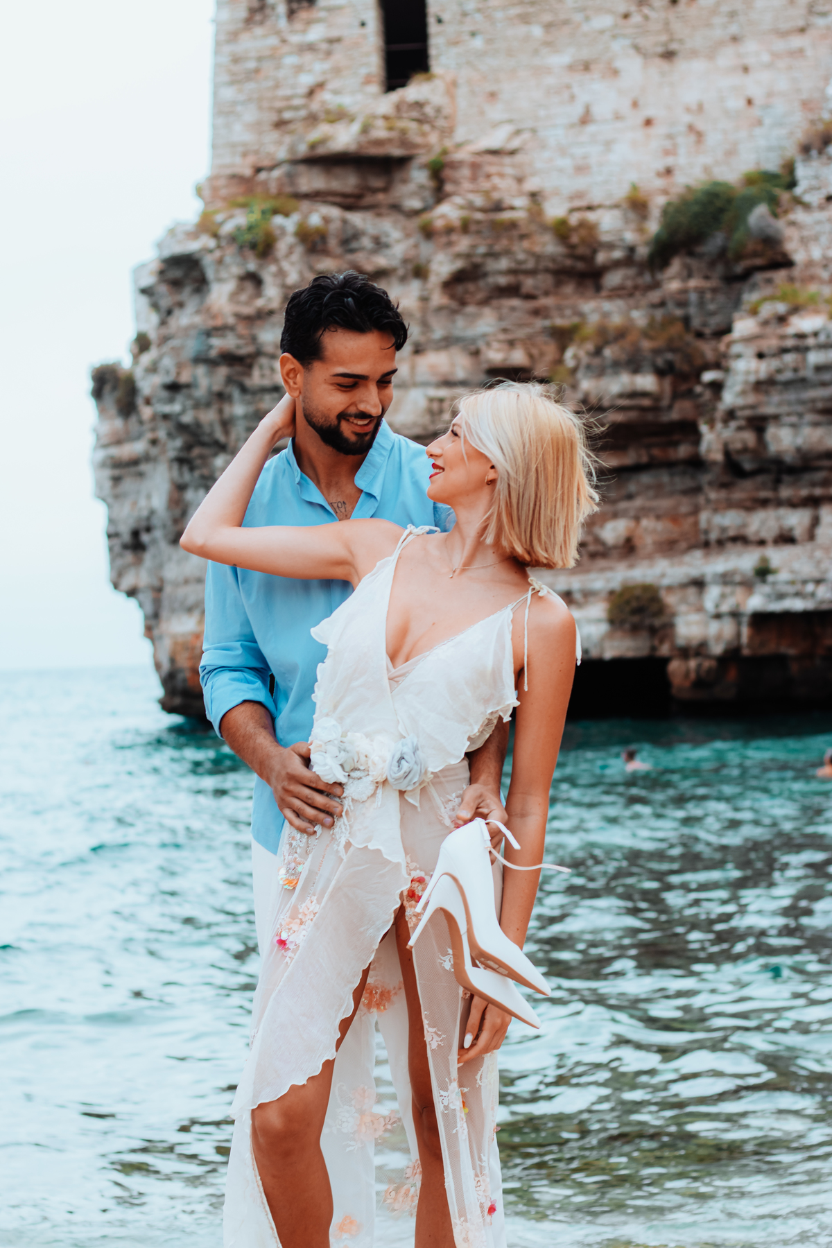 Em Polignano a Mare, esse casal viveu um pré-wedding cheio de vida e de significado. Entre o azul do mar, os gestos espontâneos e a alegria que transbordava, cada instante se transformou em memória eterna.