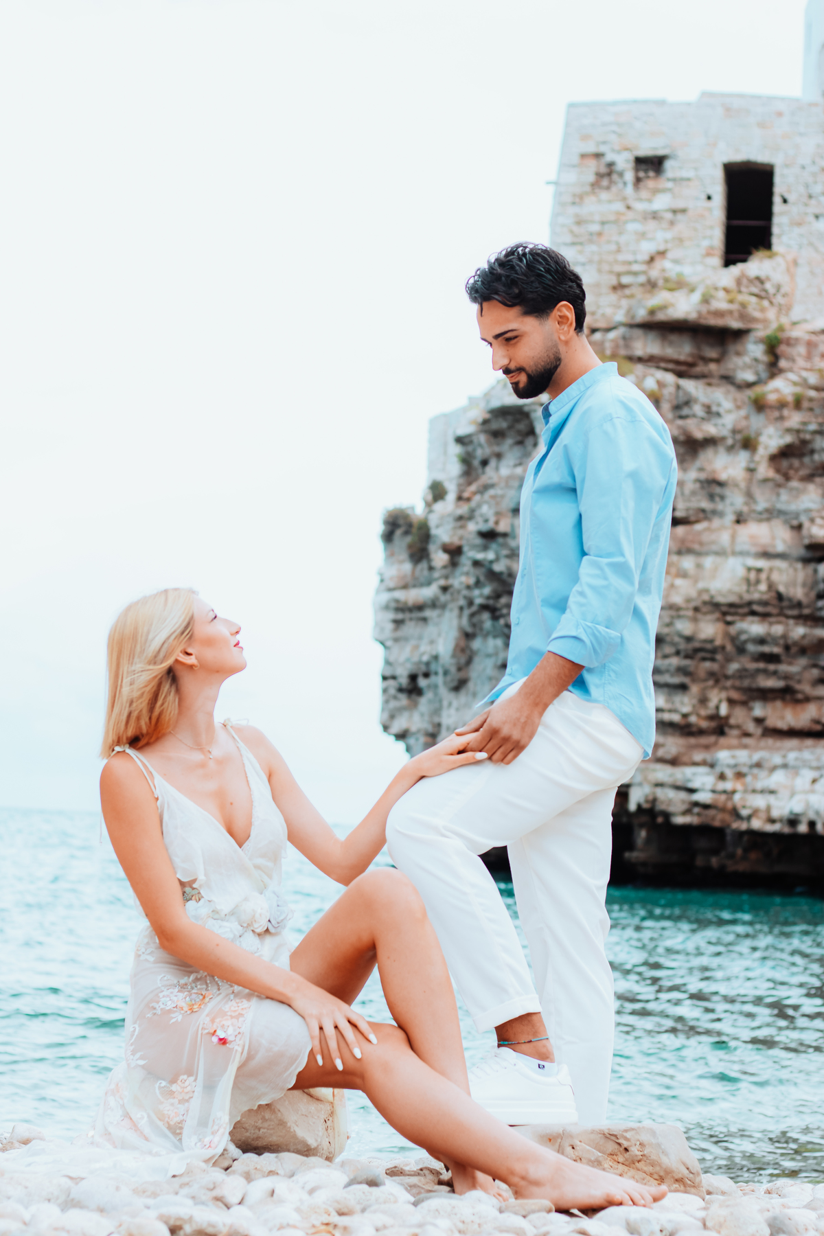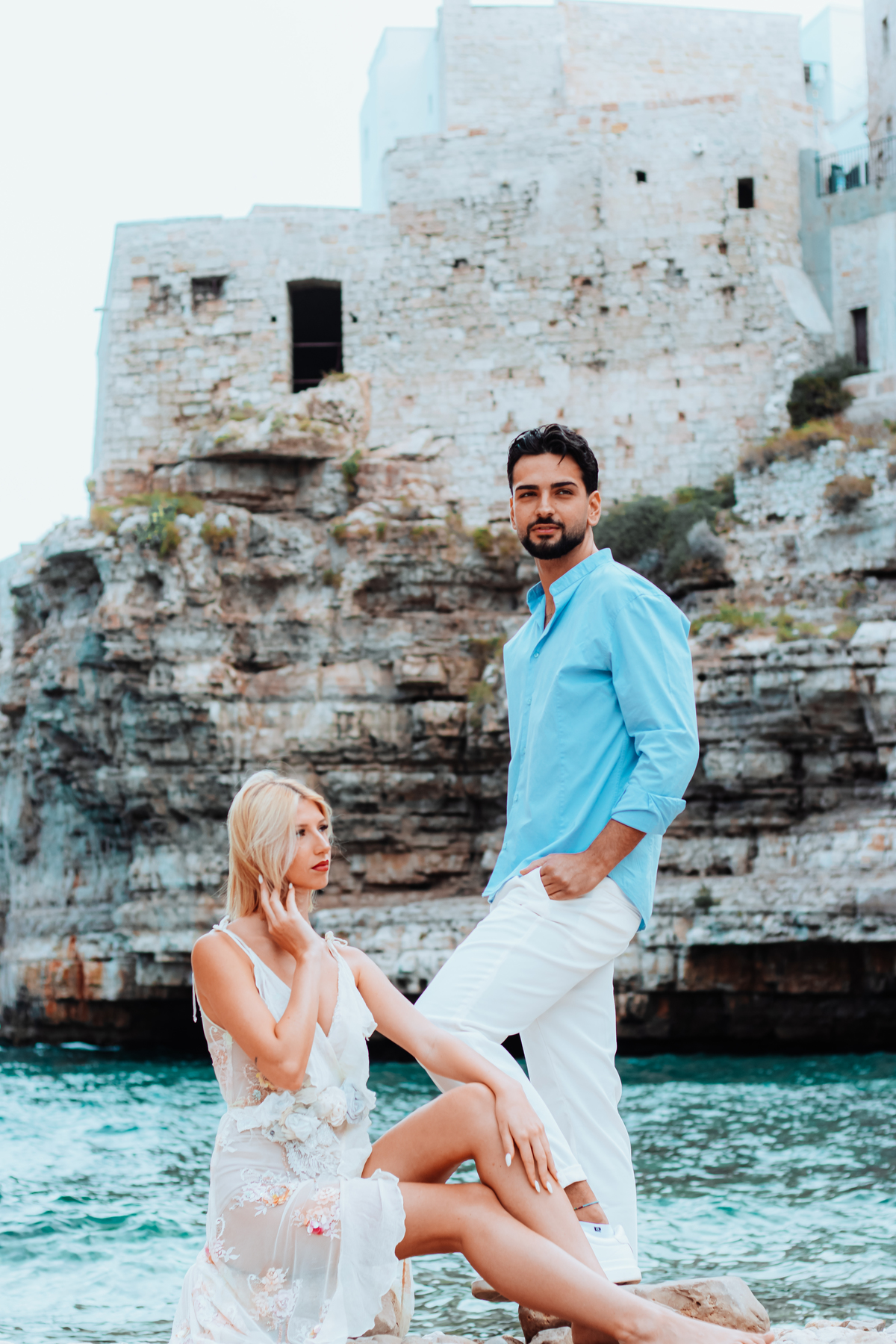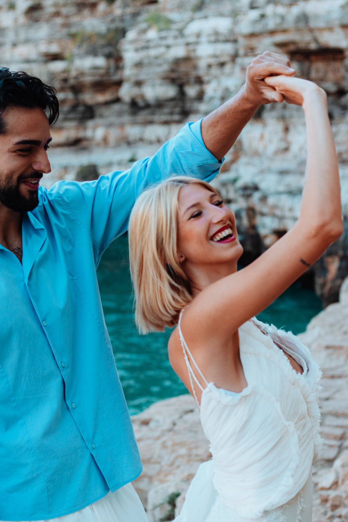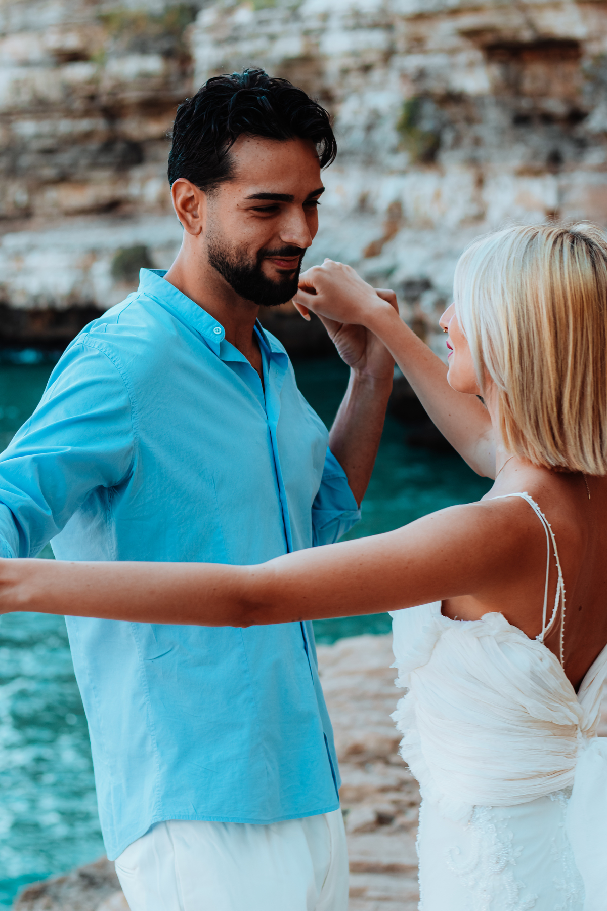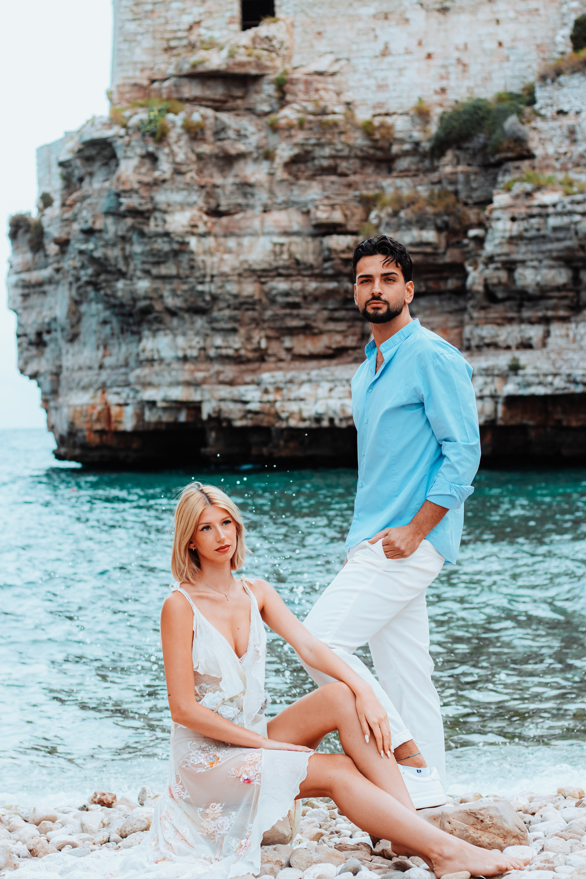 A Polignano a Mare, questa coppia ha vissuto un pre-wedding pieno di vita e significato. Tra l’azzurro del mare, i gesti spontanei e la gioia che traboccava, ogni istante si è trasformato in un ricordo eterno.