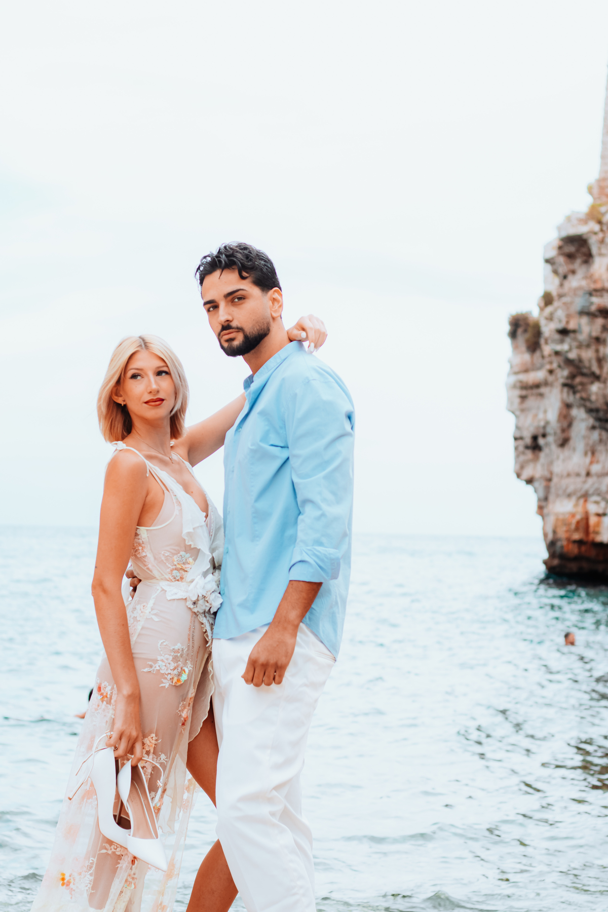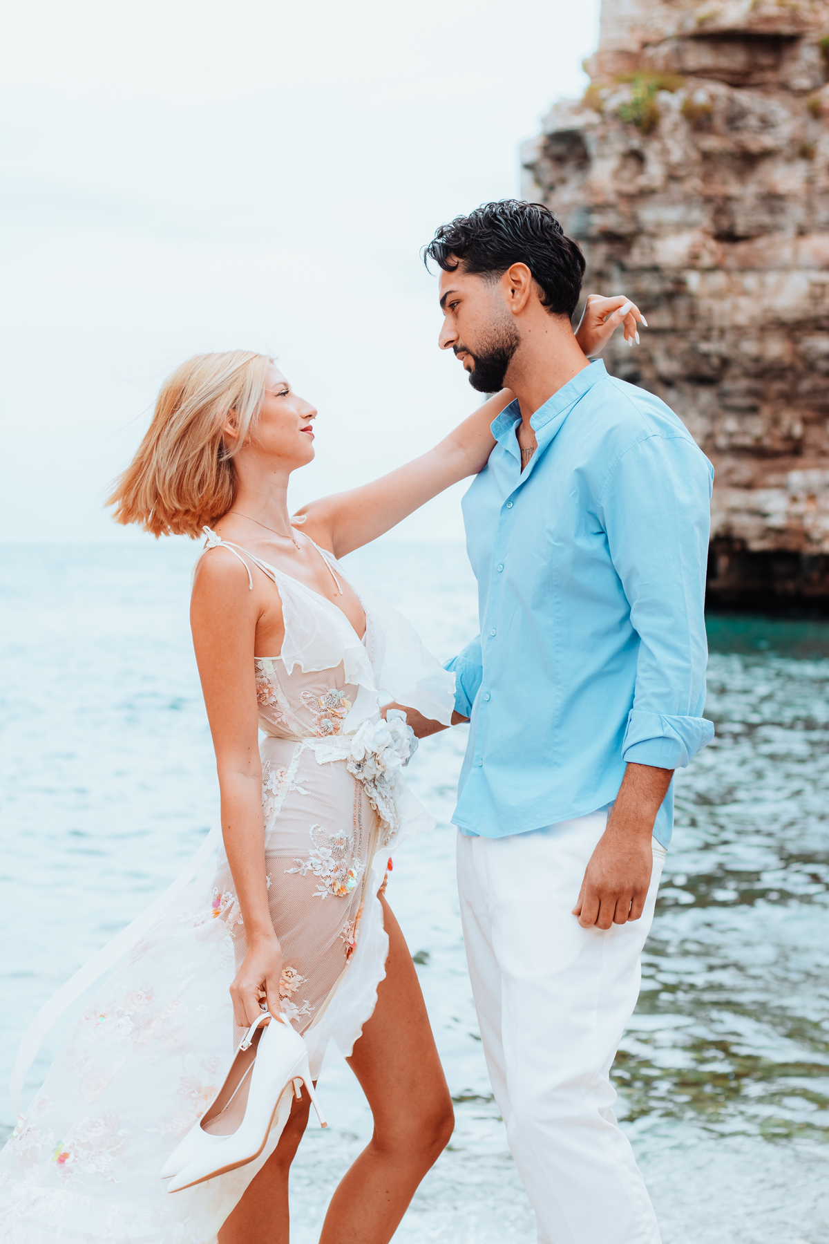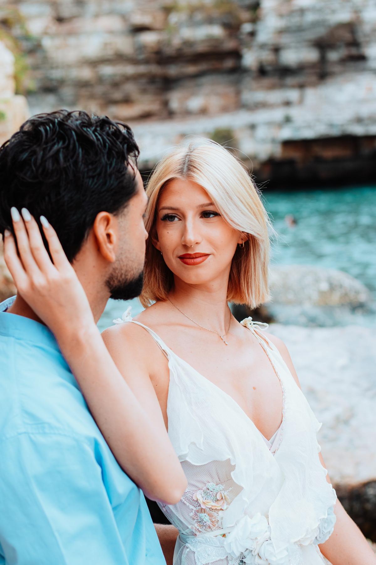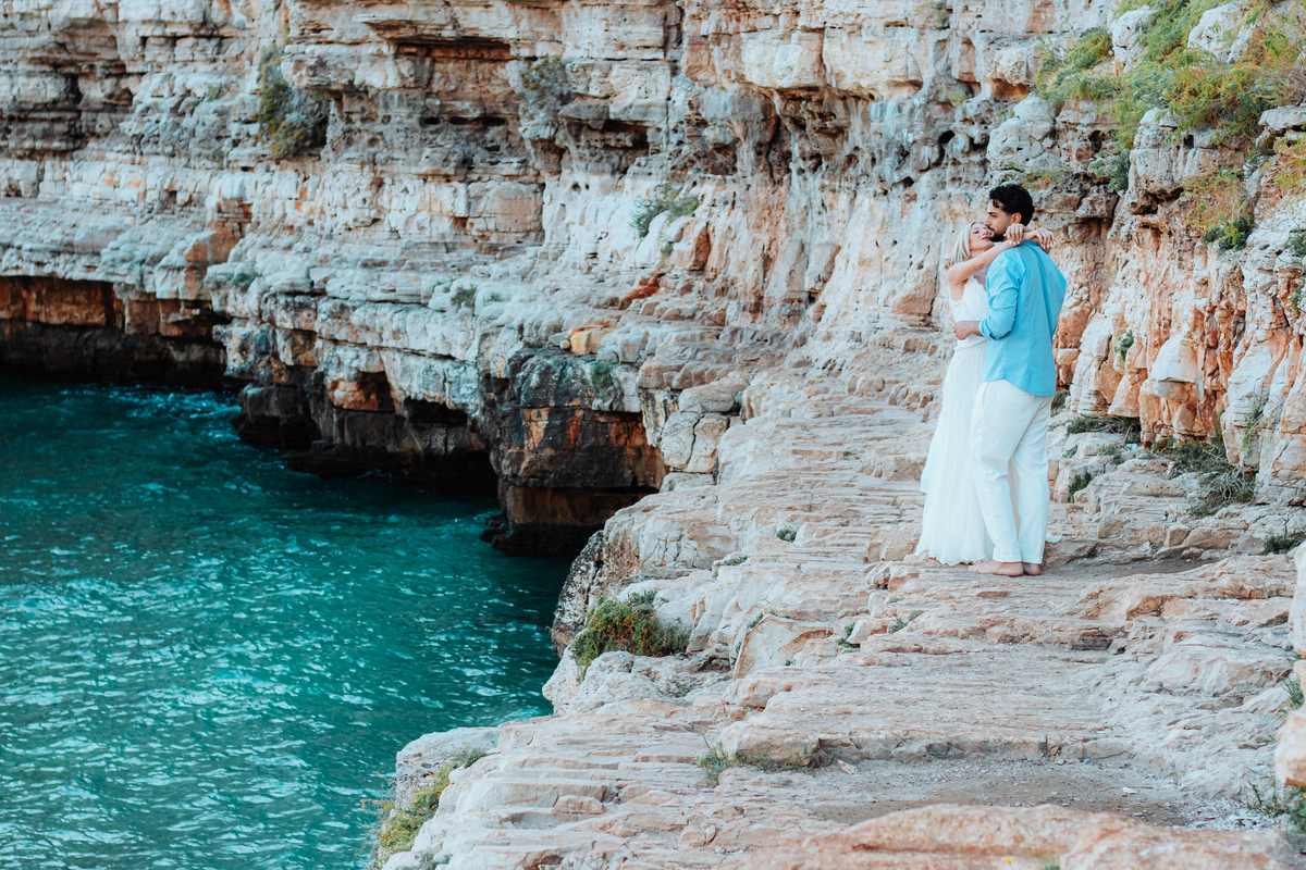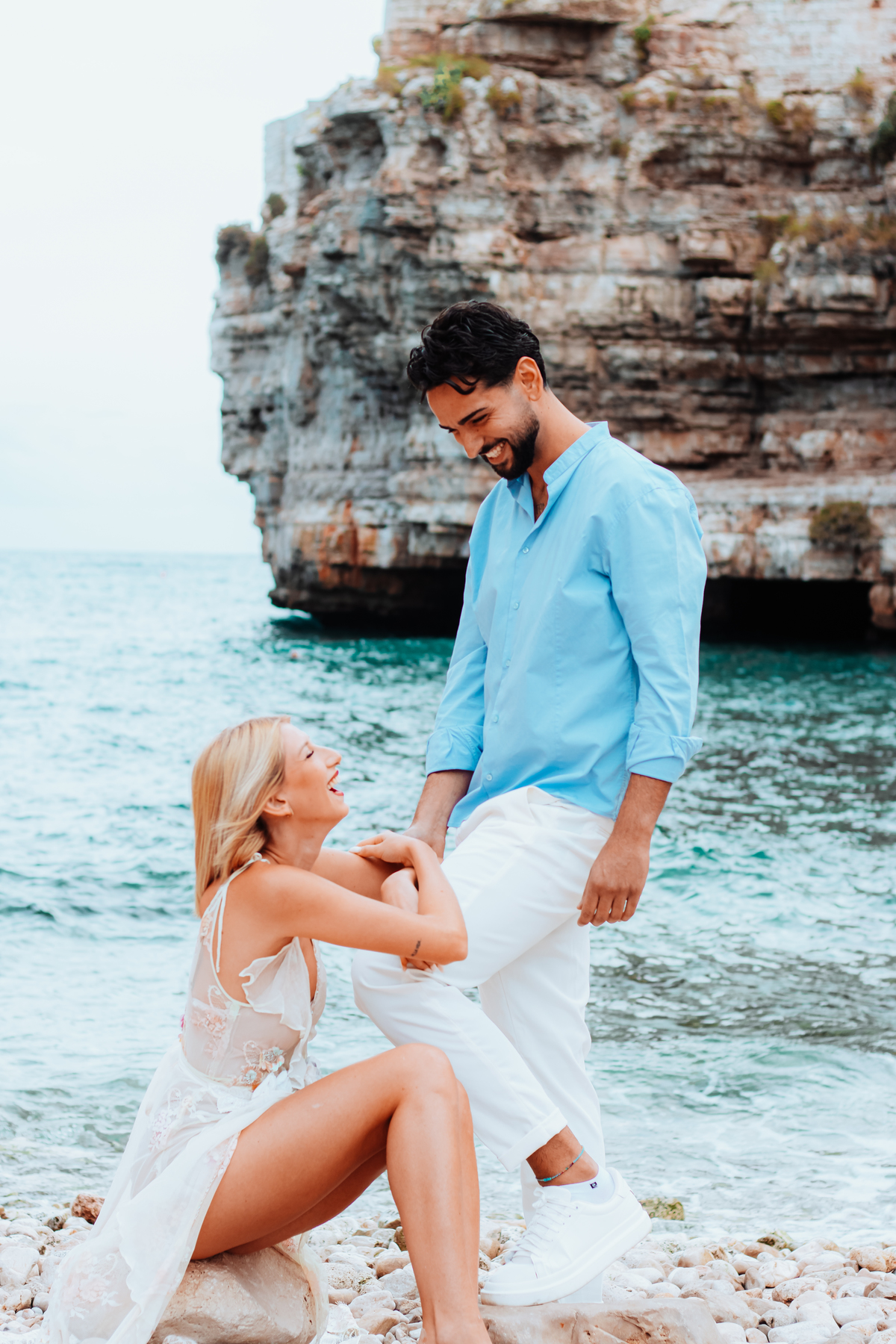 A Polignano a Mare, questa coppia ha vissuto un pre-wedding pieno di vita e significato. Tra l’azzurro del mare, i gesti spontanei e la gioia che traboccava, ogni istante si è trasformato in un ricordo eterno.