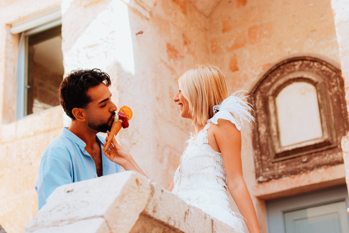 De um brinde compartilhado, de um sorvete dividido, de um riso que ecoa entre as ruas de pedra branca do sul da Itália.